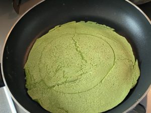 生地がまだゆるい状態で返そうとすると切れるので要注意です。最初に流した生地が少しきつね色になるくらいなってからひっくり返すと綺麗に両面焼けます。